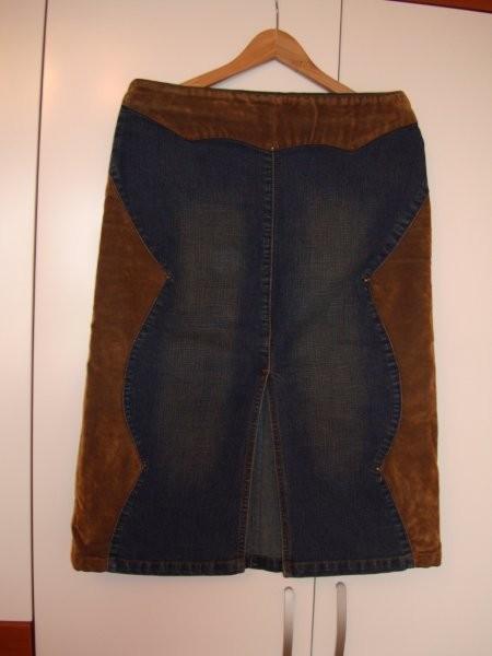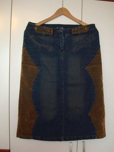 Джинсовая юбка с бежевыми замшевыми вставками по бокам. Фирма Q-ZEN, размер 46-48. Застегивается на небольшой молнии впереди и сзади большой разрез (фото прилагаются).Возможна доставка почтой. |