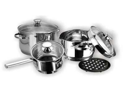 Набор посуды (7 предметов) 24 см, Кастрюля с крышкой (6,3л) 20 см, Кастрюля с крышкой (4,1л) 18 см, Кастрюля с крышкой (3,1л) Бакелитовая подставка * Многослойное термоаккумулирующее дно * Крышки из термостойкого стекла * Ручки литые из нержавеющей стали 18/10 * Способ крепления ручек: на клепках * Шкала литража на внутренней стенке |