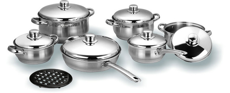 Набор посуды (13 предметов) 24 см Кастрюля с крышкой (5,1 л) 20 см Кастрюля с крышкой (2,95 л) 18 см Кастрюля с крышкой (2,1 л) 16 см Кастрюля с крышкой (1,5 л) 16 см Сотейник с крышкой (1,5 л) 24 см Сковорода с крышкой (2,45 л) Черная бакелитовая подставка * Многослойное термоаккумулирующее дно * Крышки из нержавеющей стали * Ручки из нержавеющей стали 18/10 * Способ крепления ручек: на клепках * Матовая и зеркальная полировка |