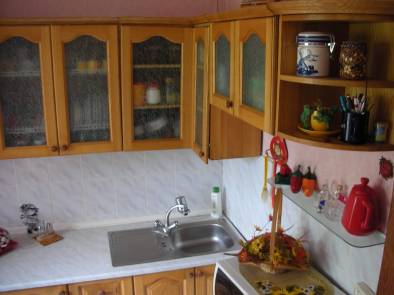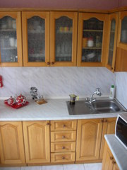 Угловая кухня в хорошем состоянии. Натуральный материал: ясень. Размеры: длина одной стороны - 1,6м, длина второй стороны по низу 2,1м, по верху (за счет навесных полочек над плитой) 2,7м. Контактный телефон: 067 234 77 19 - Валентина |