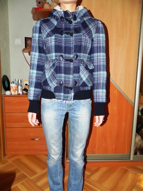 Куртка осенняя, с утепленным капюшоном, с модными пуговицами, на замочке, размер самый маленький (S). |