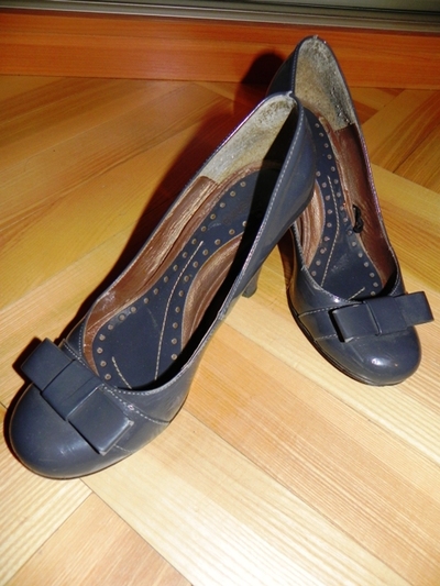 туфли практически новые, каблуки обтянутые, чуть-чуть покоцаные, но не существенно. Размер 38, темно серые, лакированные, с бантиком, очень стильные, Bershka. |