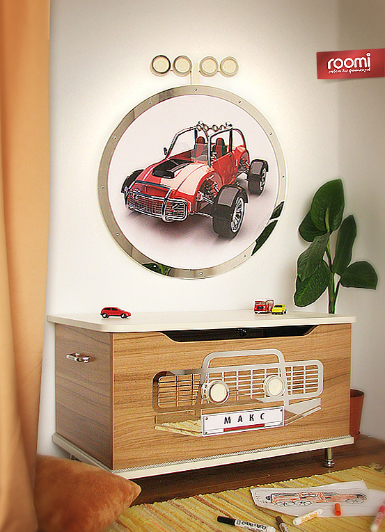 Сундук для игрушек «Ралли» с именем ребенка + постер в круглой рамке