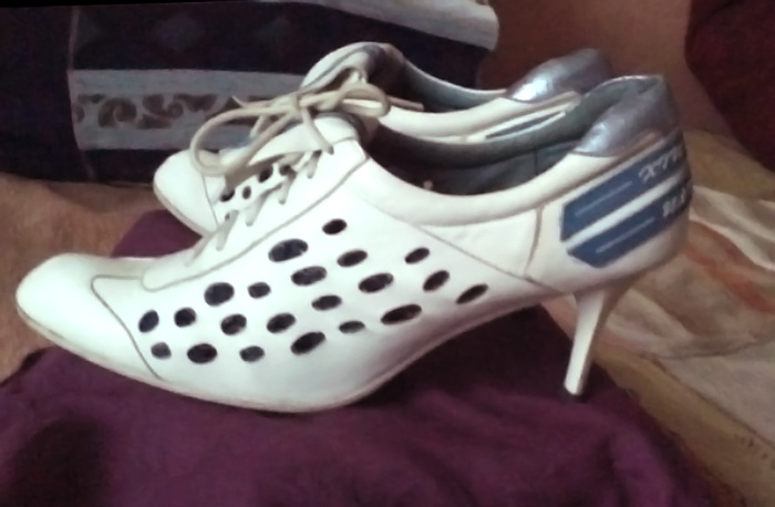 Туфли, ботиночки женские летние кожаные. Размер 38, но нормально сидит и на 39.Б/у, состояние на 4, кожа в некоторых местах немного пожелтела, на одном язычке оторвался хлястик для шнурка. Белые с голубым. Материалы – кожа натуральная и снаружи и внутри. Оригинальный дизайн в спортивном стиле но на изящном каблучке средней высоты. Отличная вентиляция (что летом актуально) через декоративные отверстия. Для смелых модниц.Торг. |