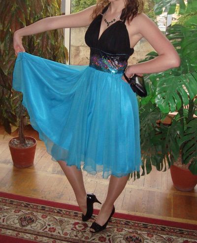 Авторское платье идеально подходящее для выпускного вечера, праздника или вечеринки. Лучше всего будет сидеть на высокой стройной девушке. Размер: 36-38. Спина открыта, пояс обшит паетками. Помимо красоты, яркости и эксклюзивности, это платье также отличается необыкновенным удобством, что очень важно!!! P.S. Бирюзовый атласный палантин размером 70*210 см прилагается в подарок). |