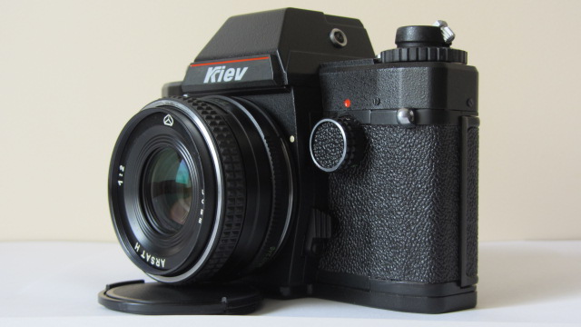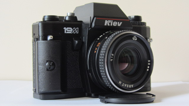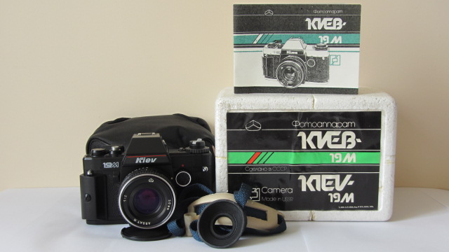КИЕВ-19М-малоформатный зеркальный фотоаппарат системы ТТЛ с полуавтоматической установкой экспозиции.