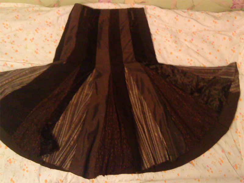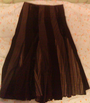 Коричневая вельветовая юбка ос вставками. Задняя часть –вельвет, передняя – вельвет, кружево, бархат и др. размер- 38. Талия – 35см, длина – 72см. Состояние идеальное. |