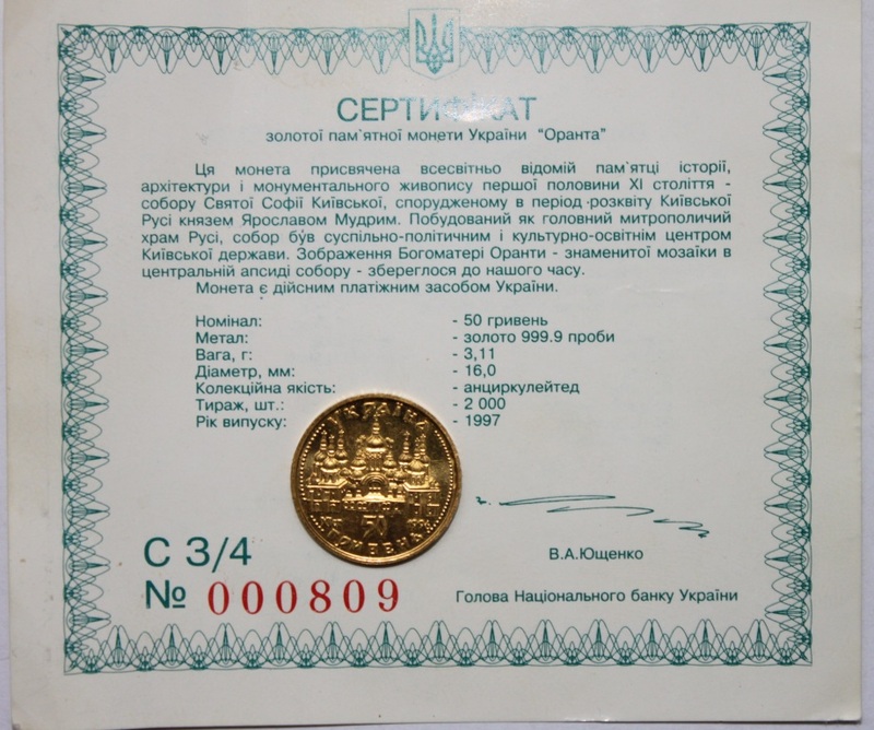 Монета 50 грн. «Оранта» (1997) Золото 999, 9 - Монеты, банкноты