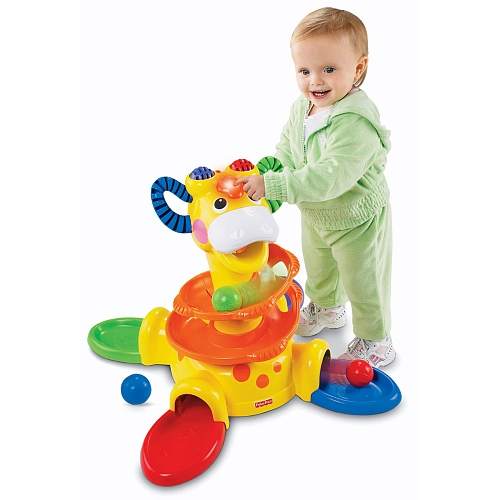 Когда малыш сидит, он видит, что шарик, спускаясь по спирали, то появляется в поле зрения, то пропадает, что вызывает у него интерес и желание посмотреть - куда он пропадает? Опять же, выкатившийся шарик на противоположной от малыша стороне "позовет" его к себе и малыш попытается достать его - если не сможет дотянуться рукой, - прийдется ползти! Желание запустить шарик с самой вершины (как это делает мама!) - стимулирует малыша тянуться вверх и вставать. В этом процессе вставания ему помогут уши жирафа - они сделаны в виде петлей - ручек, чтобы малышу было удобно хвататься.