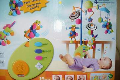 Музыкальный мобиль-каруселька на кроватку для малышей от 0 месяцев. Замечательный яркий мобиль для Вашего уникального малыша! Идеально подходит для любого состояния ребёнка: активного бодрствования, спокойного отдыха и нежного сна. Малыш будет наблюдать за медленным вращением симпатичных зверушек и засыпать, убаюканный тихой мелодией. Стойка мобиля легко и быстро крепится к кроватке малыша при помощи ручки-держателя и большой гайки в форме цветка. Музыкальное устройство находится в основании мобиля. Выбор мелодии происходит лёгким нажатием на яркую цветную кнопочку, рядом с которой написано имя композитора (Моцарт, Бетховен, Бах). Спокойная классическая мелодия звучит в течение 15 минут. |