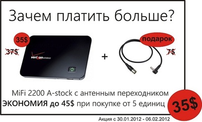 Акция! MiFi 2200 A-stock + антенный переходник за 35$ Экономия до 45$ при покупке от 5 единиц Акция действительна с 30.01.2012 до 06.02.2012 Компания EVDOshop Сергей 0661309010, 0660308010, 0995509010, 0961300010, 0930309010 |