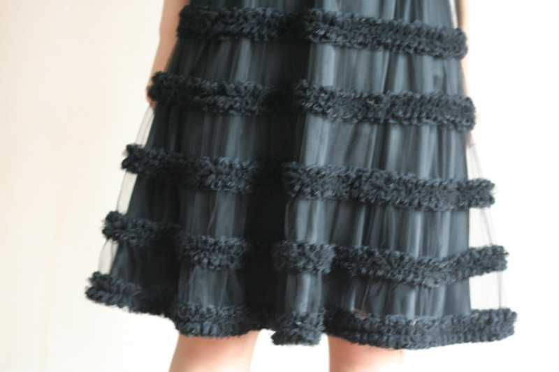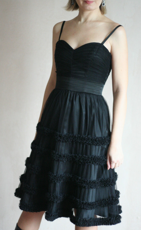 Беспроигрышный черный. Тонкие бретели лифа, драпировка из мягкого тюля на корсетной основе и многоярусная верхняя юбка создают впечатление воздушности платья и его обладательницы. размер 42-44 |