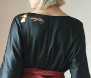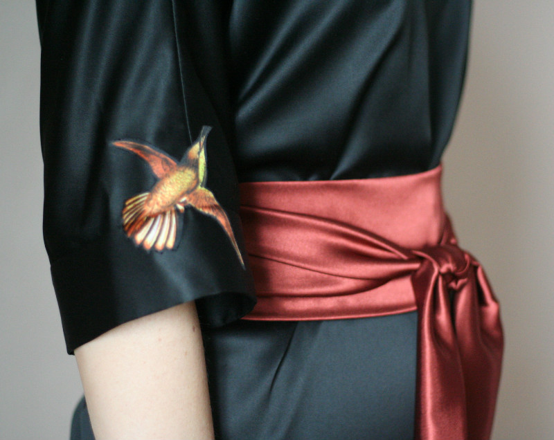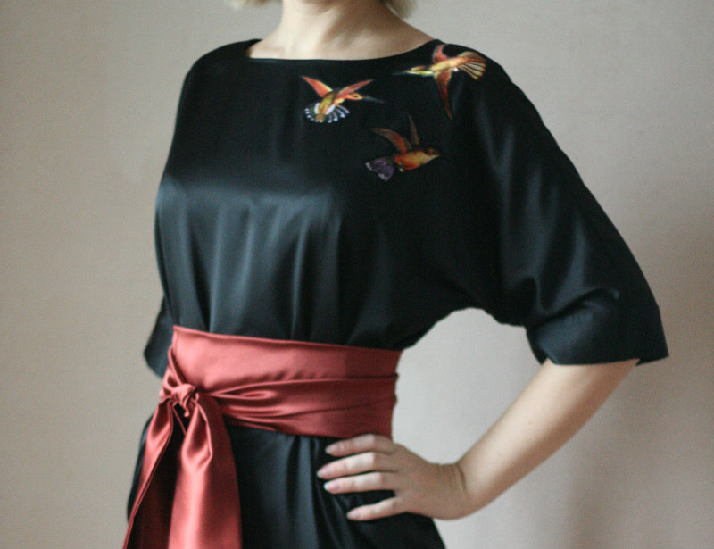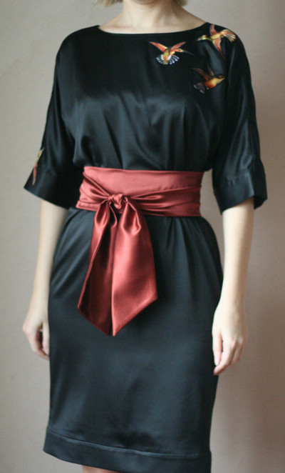 По-восточному сдержанное шелковое платье сочетает красоту и комфорт. Вашу хрупкость и изящество подчеркнут мягкий терракотовый пояс и аппликация в виде колибри. размер 42-44 |