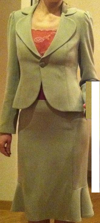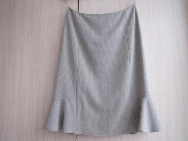 Офисный костюм: юбка и пиджак, цвет светло серый. Юбка модельная, внизу по бокам - оборка. Состояние отличное. Только что из имчистки |