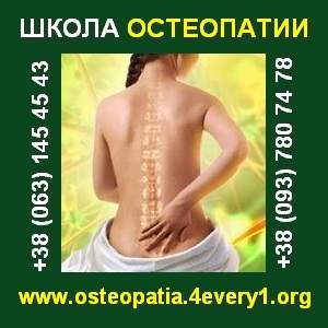 Школа ОСТЕОПАТИИ в Киеве предлагает: Обучение структурной остеопатии. Обучение черепной остеопатии. Обучение висцеральной остеопатии. Обучение органической психо остеопатии. Образование в области: - телесной терапии; - анатомии человеческого тела; - диагностики и терапии сегментов тела. Остеопатическая школа: курсы, семинары, занятия, тренинги. Школа остеопатии - диплом, сертификат остеопата, стандарт ВОЗ. +38(063)1454543 +38(093)7807478 www.osteopatia.4every1.org |