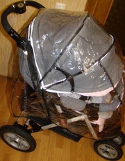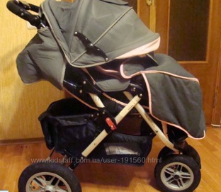 Это маневренная, удобная, красивая, теплая, на надувных колесах, коляска. Современный устойчивый трицикл с передним спаренным колесом. Яркие светоотражающие полоски в обшивке коляски.
