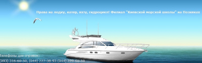 филиал киевской морской школы предлагает всем желающим обучиться мастерству вождения маломерным судном (лодка, катер, яхта, гидроцикл) и получить права судоводителя государственного образца. если вы не имеете времени и возможности посещать курсы - филиал киевской морской школы предоставляет уникальную возможность пройти курс обучения и получить права судоводителя экстерном! все формы обучения и получения прав. консультации. помощь специалистов. набор студентов проводиться постоянно. вся украина! гарантия. качество. надёжность. 0442273893, 2293226, 0933166050 |