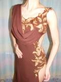 Платье в греческом стиле,Латина, насыщенного шоколадного цвета. Хочу отметить, что цвет действительно насыщенный шоколадный ( за счет вспышки , цвет засветился) Ткань бифлекс, красивые аппликации с цветов, украшенные бисером, паетками, шлейф спереди и сзади от правого плеча с левому бедру. Подол платья также обшит золотыми паетками. Качественный пошив, с бюстгальтером, трусиками в цвет платья. Платье новое, ни разу не танцевало. |