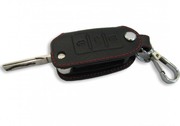 Чехол для ключей изготовлен из высококачественной кожи, по периметру обшит прочной капроновой нитью красного цвета и укомплектован различными карабинами и кольцами для монтажа различных брелков.
