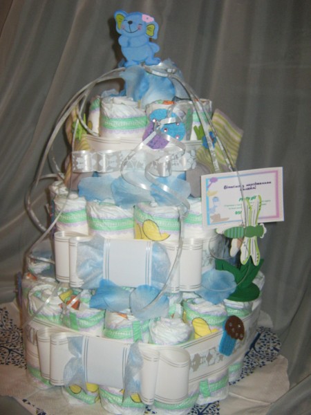 Торт может быть выполнен по заказу исходя из ваших пожеланий. При изготовлении торта сохраняется чистота и гигиеничность подгузника, все подгузники хранятся в оригинальной упаковке, при изготовлении торта подгузник не разворачивается, поэтому все подгузники можно использовать.