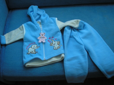 Продам голубой с белым утепленный костюмчик (тройка). Абсолютно новый. Длина брючек - 46 см, длина кофточки от горловины до низа - 23 см, длина рукава от шва - 21 см. |