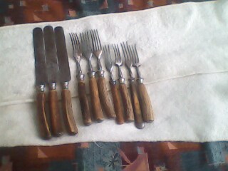 столовые пренадлежности на три персоны 11 предметов,ножи с клеймом Иосифа Францевича малы 3 шт,вилки обеденные 3шт,вилки десертные 3 шт,1 бокал,изготовлен набор из великолепной стали,ручки костяные,1 вилка десертная лишняя |