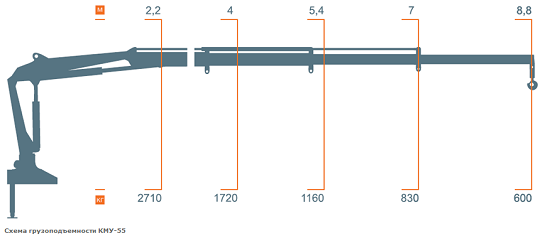 Краноманипуляторная установка КМУ-55-01 обладает гидравлическим приводом с вылетом 6,8 м., и комплектуется дополнительным удлинителем с ручным выдвижением и фиксацией. Это позволяет расширить рабочую зону до 8,6 м.
