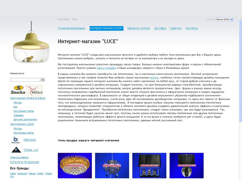 Интернет-магазин "LUCE" создан для максимально простого и удобного выбора любого типа светильника для Вас и Вашего дома. Светильники можно выбрать, заказать и получить не вставая из-за компьютера и не выходя из дома. Мы постарались максимально упростить процедуру заказа товара. Больше никаких многошаговых форм и корзин с обязательной регистрацией. http://www.luce.kiev.ua |