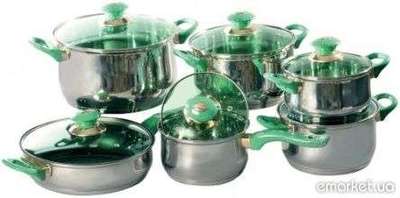 Набор посуды Maestro MR-2012 имеет следующие достоинства: - материал - высококачественная нержавеющая сталь 18/8 с внешней полировкой - сковорода имеет внутреннее антипригарное покрытие - стеклянные крышки с отверстиями для выпуска пара - удобные пластиковые ручки зелёного цвета - посуду можно мыть в посудомоечной машине - набор посуды упакован в подарочную коробку - подходит для всех типов плит и варочных поверхностей (кроме индукционных).