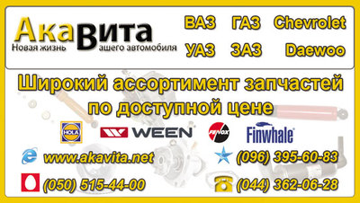 АКАВИТА продаст Автозапчасти Hola, Fenox, Finwhale, Ween для отечественных автомобилей Ваз, Газ, Уаз, Заз, Волга, Нива, Daewoo Lanos, Chevrolet Niva. (044)362-06-28 (050)515-44-00 (096)395-60-83 http://akavita.net |