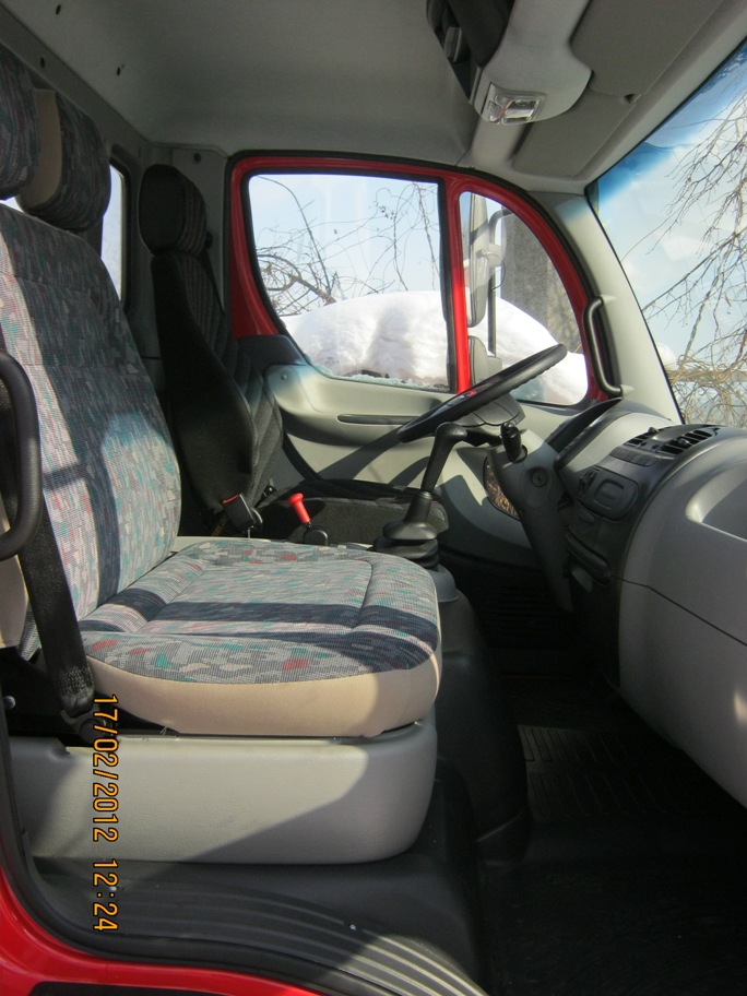 Кабина: стальная, оцинкованные панели, антикоррозийное покрытие, откидной механизм, внешние зеркала по директиве ЕС 2003/97/EC. Боковая защита с габаритными фонарями. Сиденье водителя на пневматической подвеске, двойное пассажирское сиденье. Регулируемая рулевая колонка. Цифровой тахограф, ручные стеклоподъемники, кондиционер с ручным управлением. Противосолнечные козырьки, пространство для хранения вещей, аудиоподготовка для установки радио/CD (динамики + антенна). Ширина кабины – 2 350 мм.