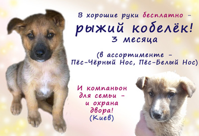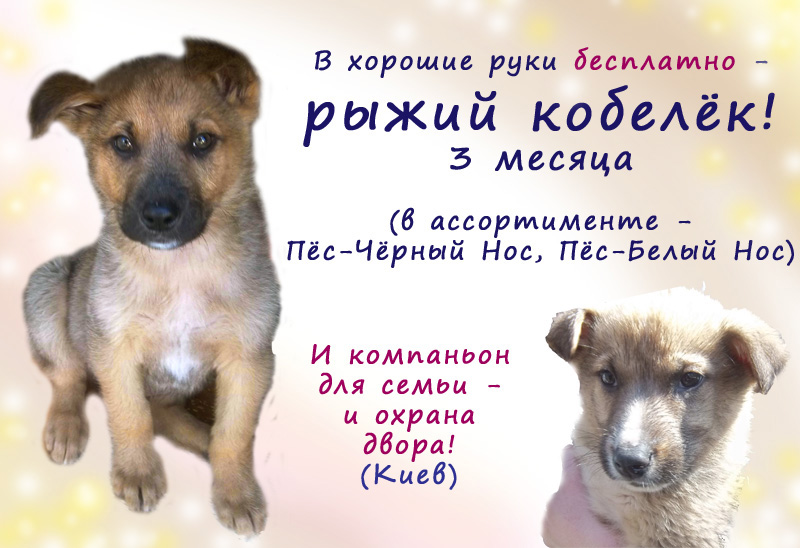 В хорошие руки бесплатно - рыжий кобелёк! Родился в феврале 2012, будет среднего роста. (в ассортименте - Пёс-Чёрный Нос, Пёс-Белый Нос) И компаньон для семьи, и охранушка! Татьяна, 066 852 95 67 (Киев) |