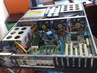Характеристики: Rackmount 2U, реек нет. В наличии 4x80mm кулера и 2 корзины для дисковых накопителей (4 места). Также есть корзина под CD/DVD привод.