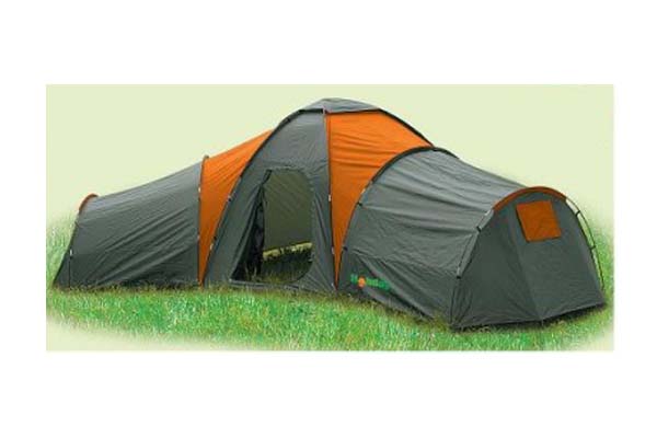 Удобная семейная палатка с тремя спальнями и одним большим жилым помещени- ем, в котором можно поставить стол. У палатки закрывающаяся входная дверь, жилое помещение без пола и вентиляционного люка на крыше. Спальные палатки изготовлены из сетчатого материала, который обеспечивает хорошую вентиляцию. Конструкция каркаса состоит из трех стекловолоконных дуг, к которым крепится наружная палатка, и дополнительно восьми дуг для спальных палаток. Внутренние палатки подвешивают в конце. Палатка подходит для отдыха с семьей или друзьями.