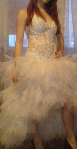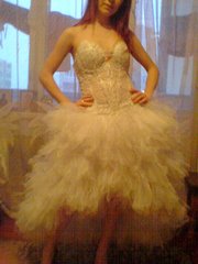 Очень красивое,необычное белое платье,в хорошем состоянии,одивалось 1 раз,не венчалось.Корсет украшен камнями и вышевкой,юбка до колен удлененная сзади,-рваный фатин.Отдельно одевается и снимаеться))пышная юбка(есть кольца) !!! Размер регулируется.Звоните,договоримся! )))) |