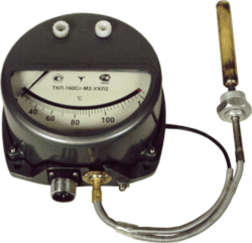Термометр манометрический сигнализирующий ТКП-160 Сг Предназначен для непрерывного измерения температуры воды, масла и других жидкостей, неагрессивных к материалам термобаллона (латунь ЛС59-1 или сталь 12Х18Н10Т), и управления внешними электрическими цепями нагревательных элементов или установок |