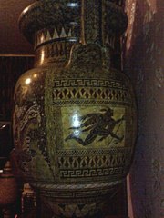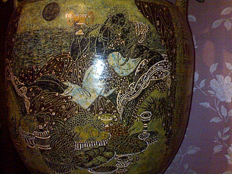 Ручная роспись ваз по легендам и мифам древней Греции.Технология необычная,интересная,очень редкая.Рисунок гравируется иглой.Геометрические узоры выполнены от руки кистью.Форма и размеры ваз,панно,можно заказать |