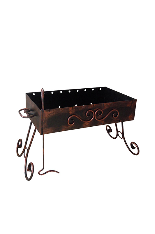 ширина 370мм длина 590мм глубина 130 мм высота с ножками 380 мм. без ножек 140мм выполнен из металла 1.5 мм Материал: сталь, покрытие – огнеупорная краска, патина |