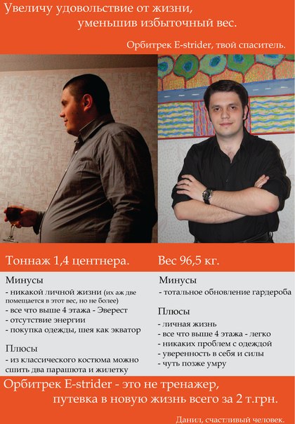 Этот орбитрек приобрел на отметке 132 кг. для увеличения эффективности снижения веса. Занимаясь всего лишь по 1.30 (где-то в среднем одно кино) и соблюдая диету можно вернуть нормальный вес.