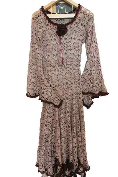 Платье вязанное крючком, лен, цвет - кофе, приталенное, рукав книзу расклешенный, на груди украшено цветком и лентой коричневого цвета. Очень нарядное. Подходит на любую фигуру за счет эластичной вязки - на худеньких высоких и на не высоких полноватых женщин и девушек. Ширина платья появляется за счет длинны платья. Размеры привожу усредненные: рукав - 60 см, нижняя часть на 10 см. длиннее объем груди - 90 см. длина платья - 132 см. Цена — 720 грн. |