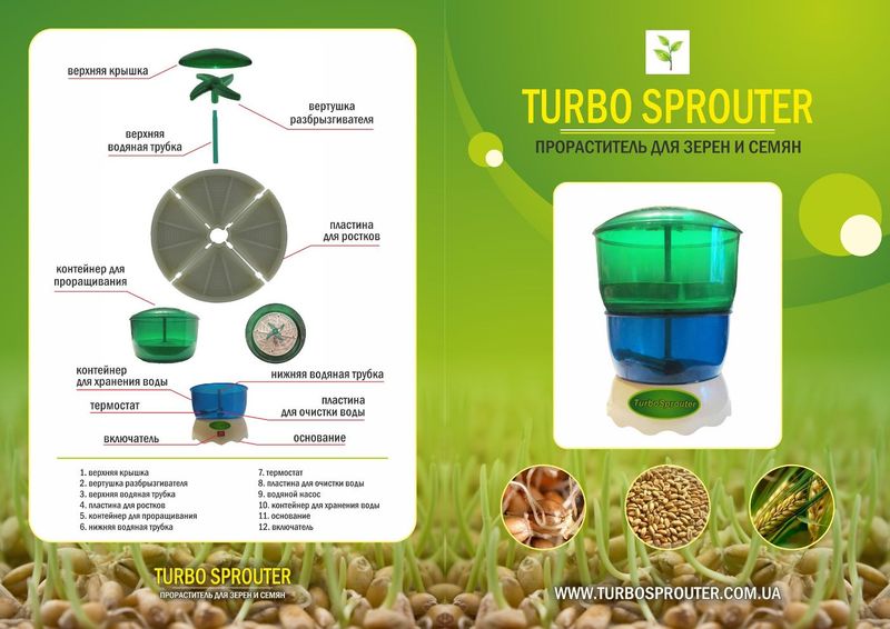 Turbosprouter– универсальный прораститель зерен и семян. Естественным образом, грамотно проращивая зерна в Turbosprouter, Вы сможете каждый день добавлять порцию здоровья своему организму. Стоимость универсального прорастителя "TurboSprouter" составляет 1499 гривен. Подробная информация есть на нашем сайте TurboSprouter.com.ua а также по телефону +38(044)361-10-23 |