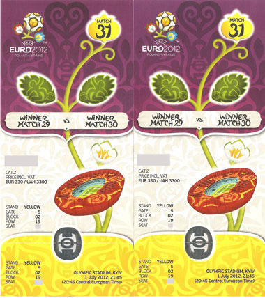 Продам недорого билеты на Евро 2012 (Чемпионат Европы по футболу 2012). Билеты приобретены на официальном сайте UEFA (УЕФА). Билеты есть на руках. 11 июня: Украина — Швеция (блок 18, ряд 19) (2 категория) — 2.500 грн. (250€) 15 июня: Украина — Франция (блок 237, ряд B) (2 категория) — 2.000 грн. (200€) 19 июня: Англия — Украина (блок 329, ряд P) (2 категория) — 2.200 грн. (220€) 24 июня: Киев: Четвертьфинал (¼) WD – RC (блок 2, ряд 3) (2 категория) — 3.000 грн. (300€) 1 июля: Киев: ФИНАЛ (блок 2, ряд 19-20) (2 категория) — 12.500 грн. (1250€) Все цены указаны за 1 билет |