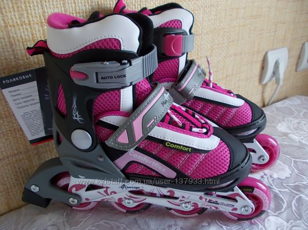 Шнуровка, бакля ELITE с двойной защитой и пяточный ремень Velcro Мягкий ботинок из синтетической кожи в комбинации с сетчатым материалом Полипропиленовая оболочка и манжета Алюминиевая рама Подшипники: ABEC-5 Carbon Колеса: PUC 64*24мм.-S, 70*24мм.-M, 72*24мм.-L жесткостью 82 A Кнопочная система регулировки на 4 полных размера Размер: L(40-43) Расцветка: розовая, красная, синяя, голубая, фиолетовая, черно-белая Больше на http://picasaweb.google.com/118002891130069120769 перешлю по Украине тел.,0982647070,0953538136 Люба |