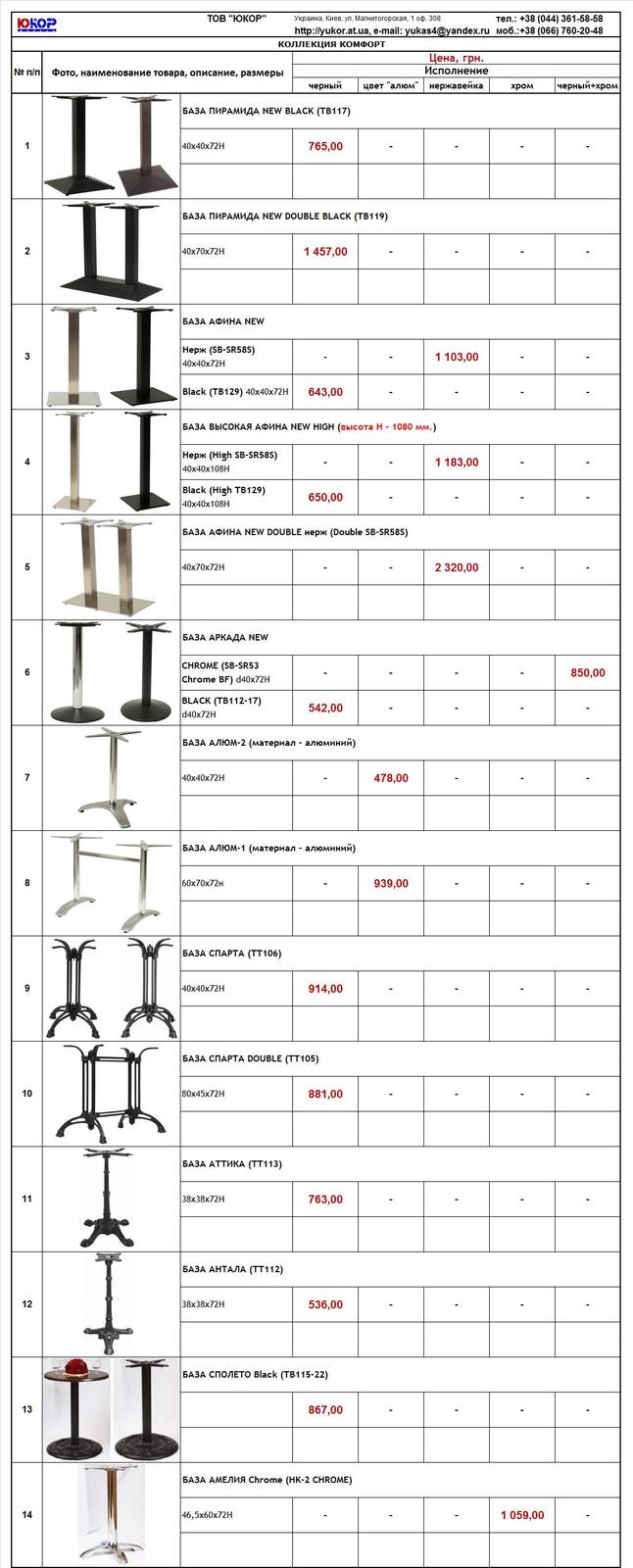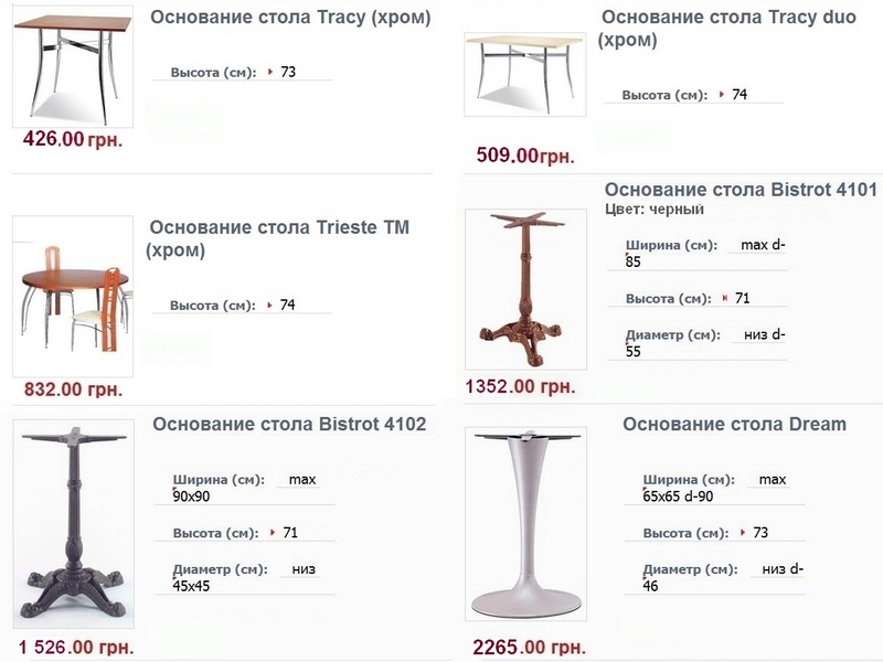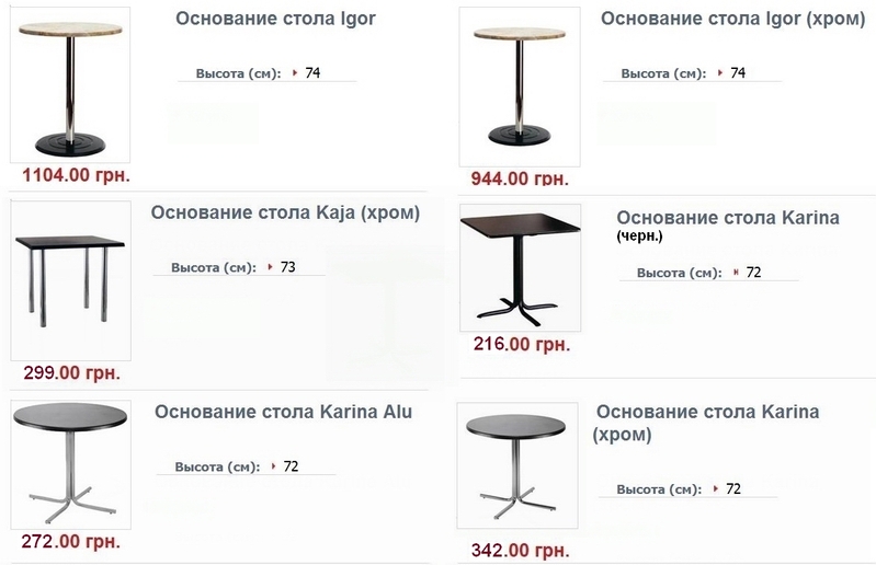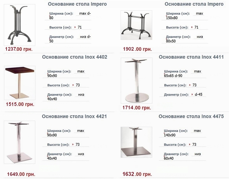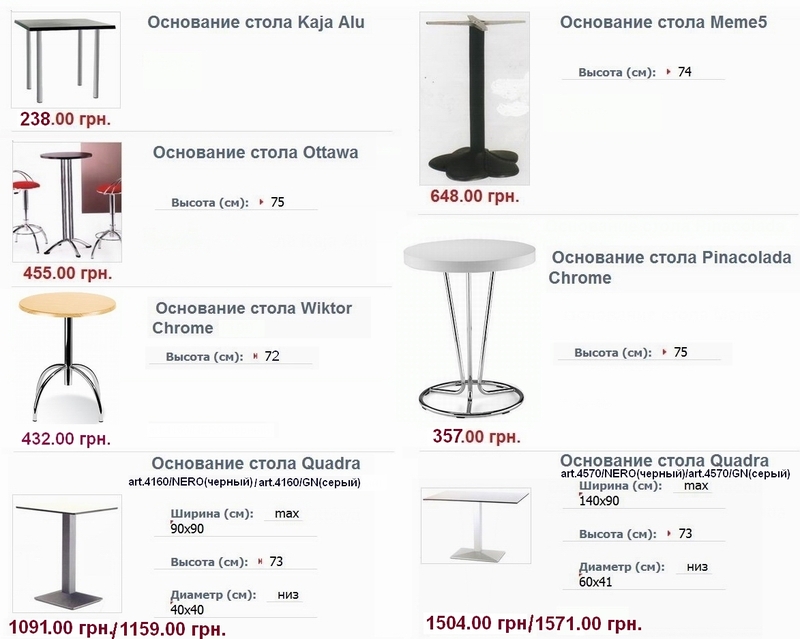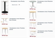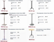 Основания под столы (h-73): Основание стола Bistro (хром), Основание стола Cafe (хром), Основание стола Dona 3 (хром), Основание стола Dona 4 (хром), Основание стола Elise art.414 (хром), Основание стола Elise art.449 (хром), Основание стола Igor, Основание стола Igor (хром),Основание стола Kaja (хром), Основание стола Karina, Основание стола Karina Alu, Основание стола Karina (хром), Основание стола Lena (хром), Основание стола Lisbona (хром), Основание стола Primera (хром), Основание стола Romina (хром), Основание стола Sonia (хром) art.480A, Основание стола Sonia Alu, Основание стола Tracy (хром), Основание стола Tracy duo (хром), Основание стола Trieste TM (хром), Основание стола 302, Основание стола 302CC, Основание стола 305, Основание стола 305CC, Основание стола 33940CR, Основание стола 34040C, Основание стола Bistrot 4101, Основание стола Bistrot 4102, Основание стола Dream, Основание стола Impero, Основание стола Impero, Основание стола Inox 4402, Основание стола Inox 4411, Основание стола Inox 4421, Основание стола Inox 4475, Основание стола Kaja Alu, Основание стола Meme5, Основание стола Ottawa, Основание стола Pinacolada Chrome, Основание стола Quadra, Основание стола Quadra, Основание стола Rocky, Основание стола Rozanna Chrome, Основание стола Rozanna Duo Chrome, Основание стола Tiramisu Alu, Основание стола Tiramisu chrom, Основание стола Tiramisu Duo Alu, Tiramisu Duo chrom. Основания под высокие столы (h 110): Основание стола Bistro (хром), Основание стола Lisbona, Основание стола 302HCC, Основание стола 305HCC, Основание стола 33940HCR, Основание стола Bistrot, Основание стола Impero, Основание стола Inox 4406, Основание стола Inox 4414, Основание стола Inox 4424, Основание стола Wiktor Chrome 1100.