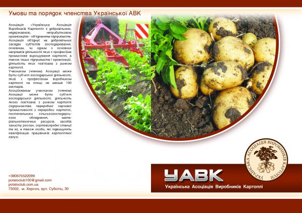 Хотите купить картофель? Обращайтесь в украинскую ассоциацию производителей картофеля. Это больше 20 лучших фермерских хозяйств Украины, которые выращивают картофель на своих полях. У УАВК вы точно найдёте картофель, который вам нужен, а так же получите нужный совет. Участником Ассоциации, могут быть те, чья деятельность, связанна с рынком картофеля (предприятия продуктовой промышленности, поставщики сельхоз оборудования, материально-технических ресурсов, удобрений и тд.)УАВК - это то, что реально поможет вашему бизнесу! Законодательно закрепленные преимущества членов Асоциации, можно узнать, непосредственно у исполнительного директора УАВК - Богдана Ростиславовича. Или на сайте Украинской ассоциации производителей картофеля.