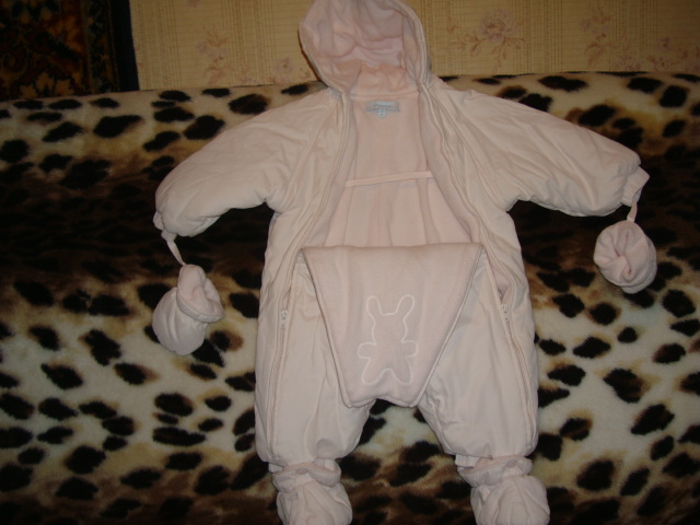 Состав: 52% полиестер, 35% хлопок, 13% полиамид. Цвет нежно розовый, очень красиво смотрится на крошечке, идеальный вариант для весны!!! Чопики на кнопках, спереди расстёгивается сверху до низу двумя молниями, рукавички на ленточке. Подходит на рост до 62 см. |