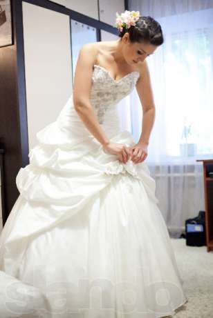 Одевалось один раз, не венчанное. После носки было в химчистке, повторной чистки не требуется. В подарок — кольца под платье.