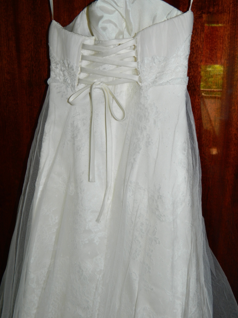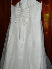 с гипюровой обводкой внизу (по краю)! С небольшим шлейфом и очень качественным корсетом на небольшой шнуровке.
