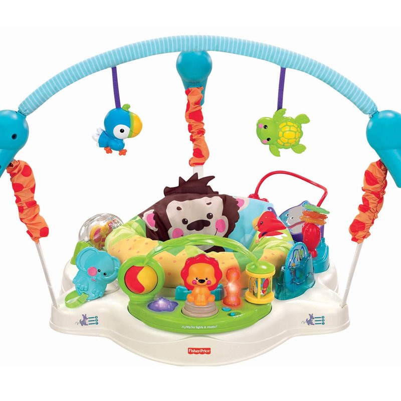 * Можно весело играть и прыгать (прыжки активируют огни и звуки) со всеми игрушками вокруг – и над головой – при этом сиденье вращается, что позволяет малышу исследовать все игрушки.