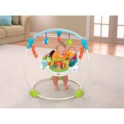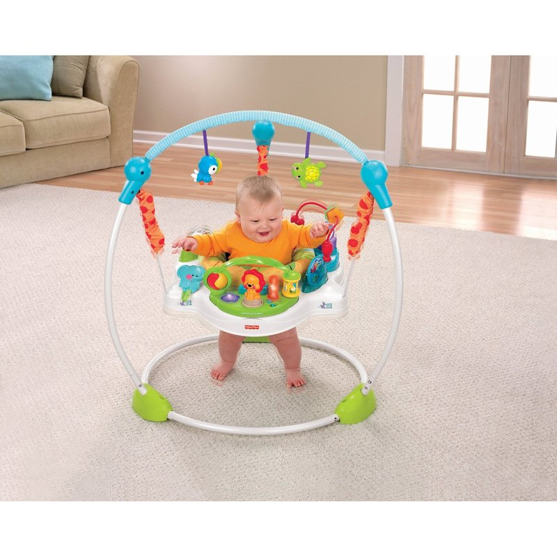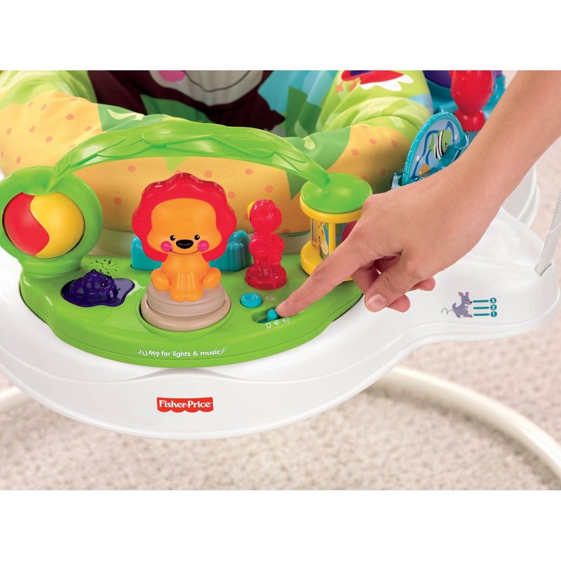 Прочная, свободностоящая конструкция позволяет малышу прыгать свободно и безопасно. Интерактивная игрушка награждает прыжки малыша огнями, звуками и музыкой. Малыш раскручивает барабан, чтобы активировать огни и музыку (мама может активировать их на 5 минут непрерывной игры).